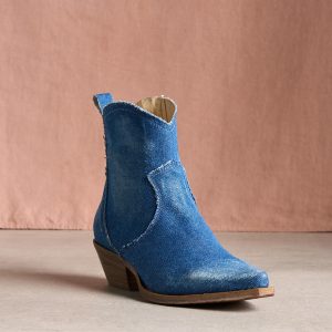 A Sundance favorite. this update to a classic features distressed denim and the subtle western details the Sojourner is known for. Heel pull tab and inside zipper. Cotton. Italy. Exclusive. Whole sizes 36-41. 36 (US 6). 37 (US 7). 38 (US 8). 39 (US 9). 40 (US 9.5). 41 (US 10).