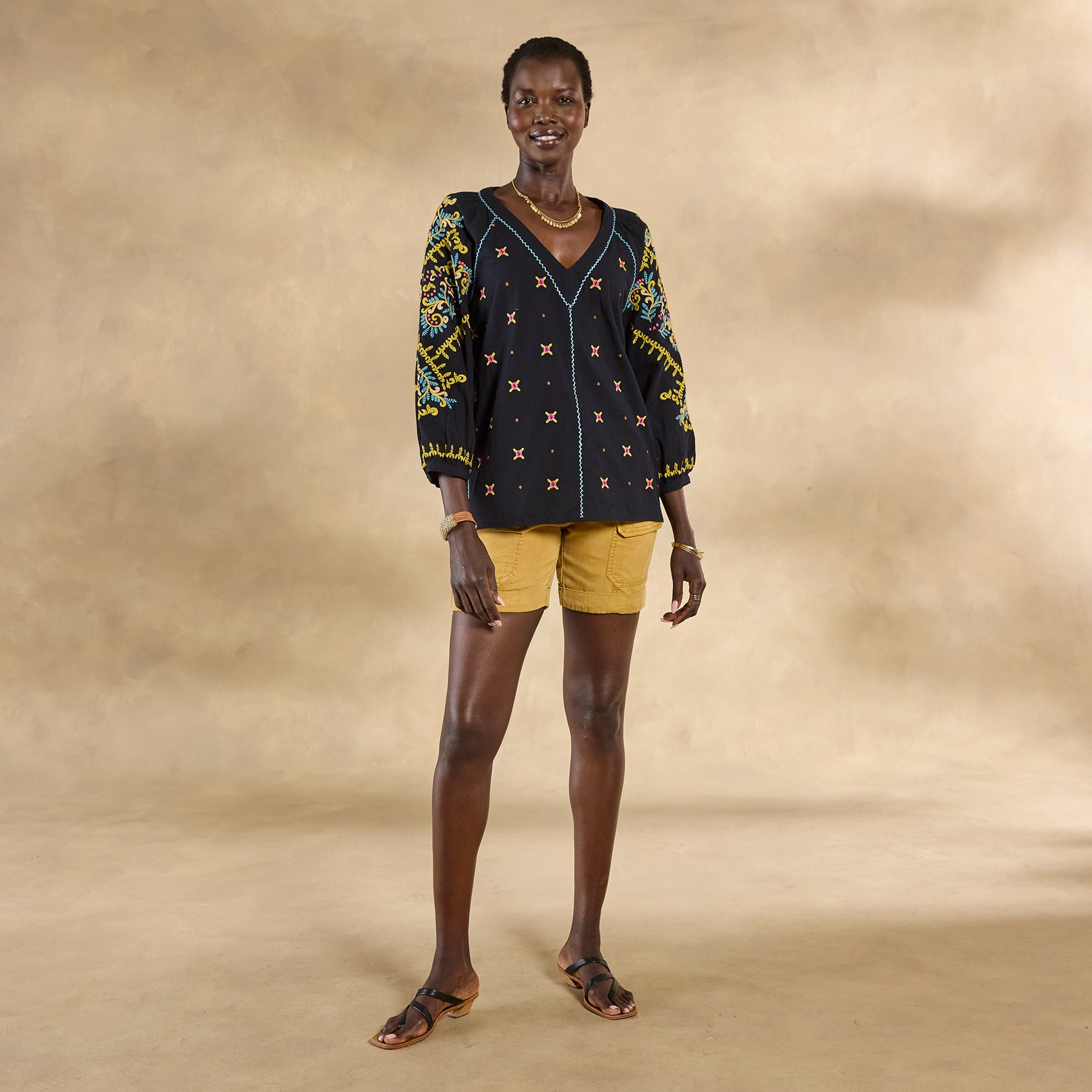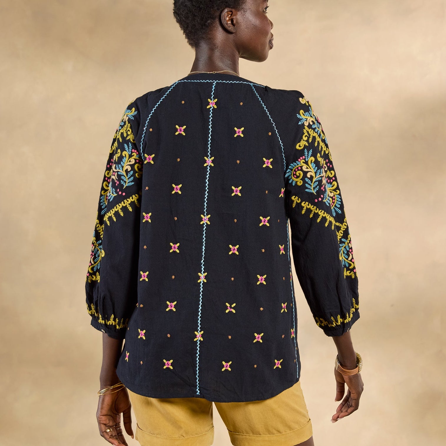 There’s joyful bohemian flair in this yarn-dyed top with luscious allover embroidery. blanket stitch details. three-quarter sleeves. shell buttons and V-neck. Full. easy fit. Cotton. Machine wash. Imported. Exclusive. Sizes XS (0 to 2). S (4 to 6). M (8 to 10). L (12 to 14). XL (16 to 18). XXL (20 to 22). Approx. 24-1/2L.
