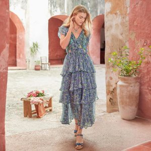 Vintage florals are gracefully printed on our easy. tiered dress. embroidered with touches of feminine detail. Cupro. Hand wash. Imported. Exclusive. Sizes XS (0-2). S (4-6). M (8-10). L (12-14). XL (16-18). XXL (20-22). Approx. 57.5l.