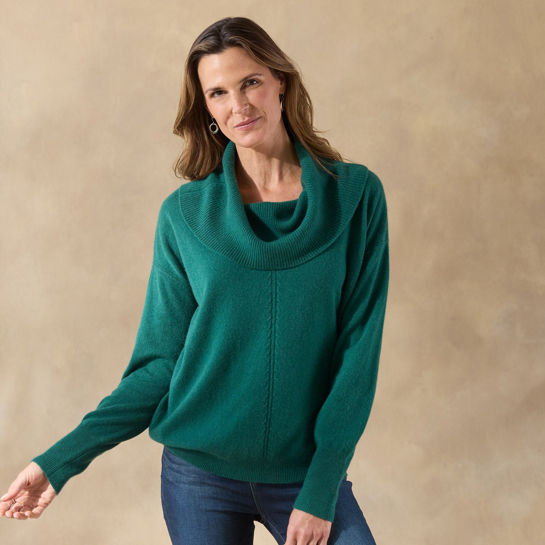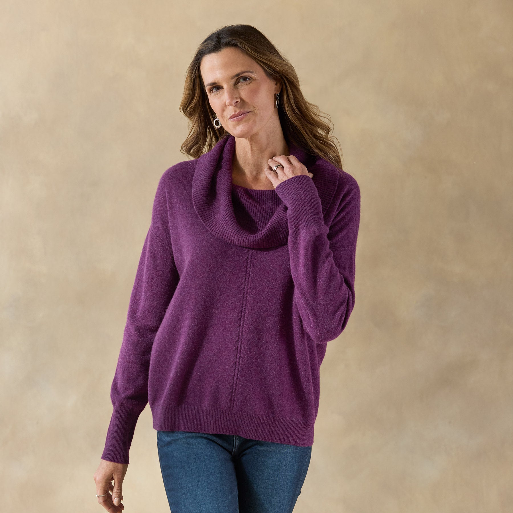 The coziest cowlneck sweater in lofty cashmere. with a ribbed cowl and sleeves. cable stitch detail at center front and back. and rib transfer details at armholes. Easy fit. Hand wash. Imported. Exclusive. Sizes XS (0–2). S (4–6). M (8–10). L (12–14). XL (16–18). XXL (20–22). Approx. 24l.