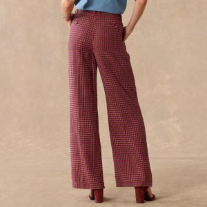 Our wide-leg trouser pants in a mini houndstooth plaid are so stylish. with faux horn buttons. double pleats. interior waistband extension for easy adjustments and four pockets. Contrast floral print at inner waistband. Cotton/linen. Machine wash. Imported. Exclusive. Sizes 0–14. 29 inseam.