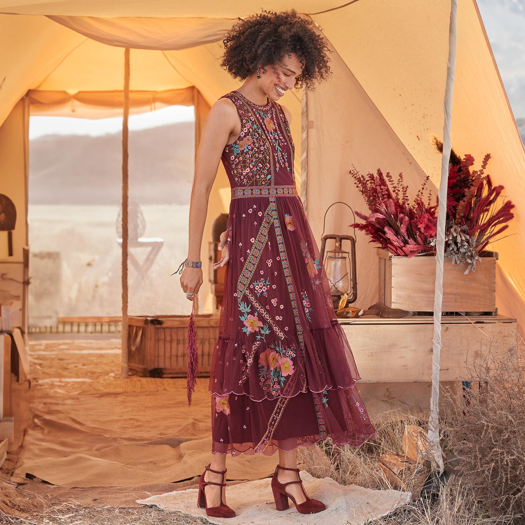 Our lovely fit and flare embroidered mesh dress features pretty florals mixed with geometric embroidery and a beautiful jewel neckline. Side zipper for an easy fit. Nylon. Hand wash. Imported. Exclusive. Sizes XS (0–2). S (4–6). M (8–10). L (12–14). XL (16–18). XXL (20–22). Approx. 54l.