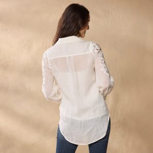 Stunning open applique and eyelet details lend feminine beauty to the sleeves and front bodice of our Monrovia Shirt. Covered buttons and lace trim. Cotton/linen. Hand wash. Imported. Exclusive. Sizes XS (0–2). S (4–6). M (8–10). L (12–14). XL (16–18). XXL (20–22). Approx. 27.5l.