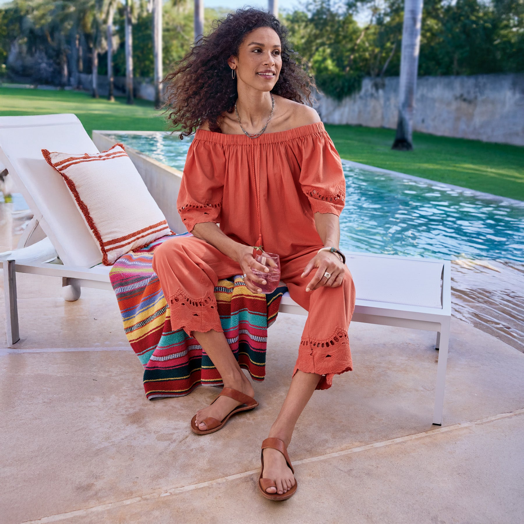 This relaxed. flowy blouse can be worn on or off the shoulder and features a smocked neckline with tasseled tie. cut-out details and embroidery. Cotton. Machine wash. Imported. Sizes XS (0-2). S (4-6). M (8-10). L (12-14). XL (16-18). XXL (20-22). Approx. 24.5l.